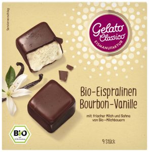 Cremige Bourbon-Vanille Praline umhüllt von dunkler Zartbitterschokolade.