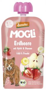 Bio-Fruchtpüree aus Apfel, Banane und Erdbeere.