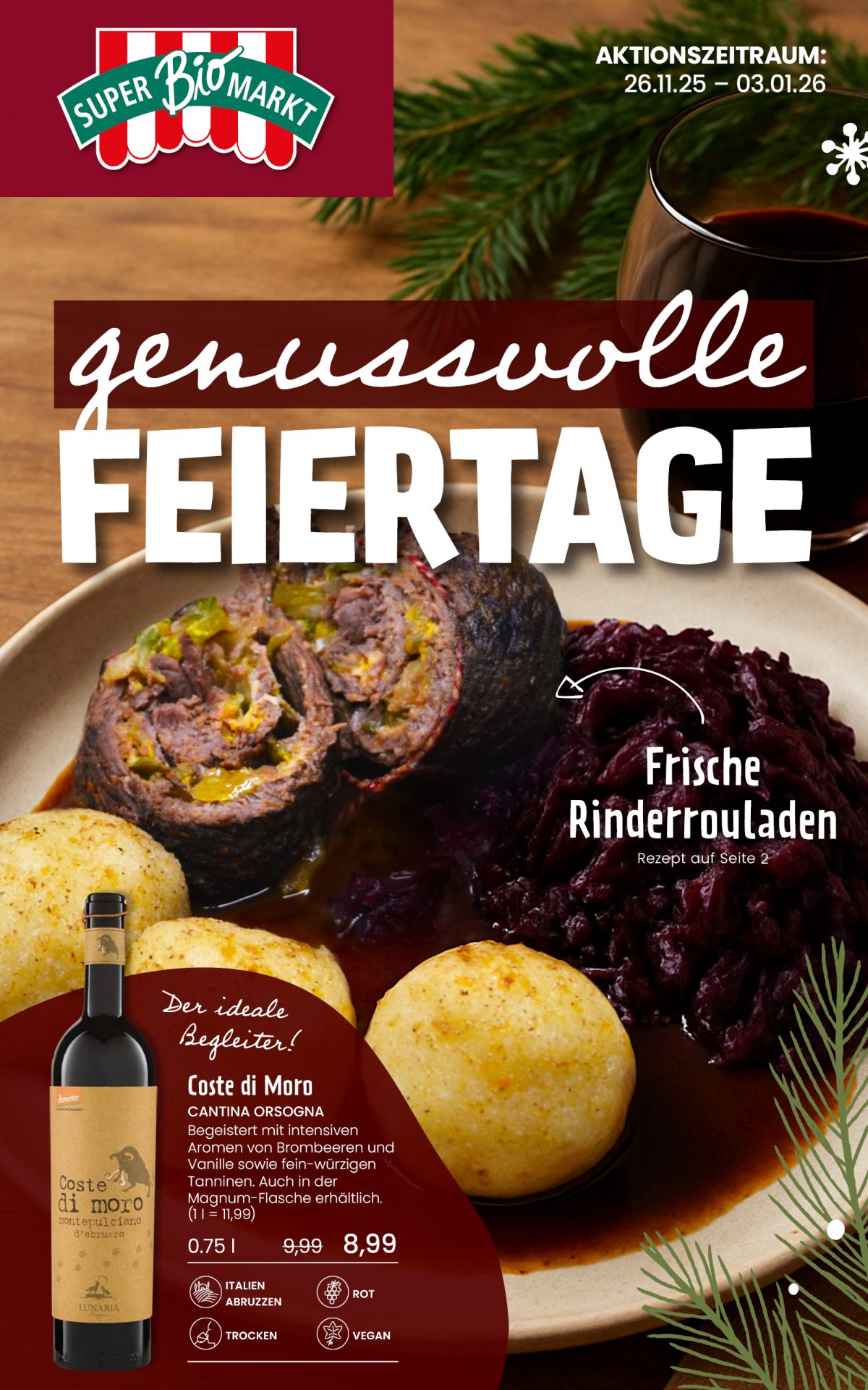 Weihnachten ist ein Fest für alle Sinne, und vor allem das gemeinsame Essen bringt uns an diesen besonderen Tagen alle zusammen an einen Tisch. Ob knuspriger Braten, zartes Filet oder eine festliche Gans – der Genuss dieser Weihnachtsklassiker gemeinsam mit deinen Liebsten schafft die besten Erinnerungen. Also genieße zu den Festtagen unser feinstes Bio-Sortiment und erschaffe ganz besondere Genussmomente. Damit der „Braten“ auch rechtzeitig auf den Tisch kommt, kannst du hier bald wieder ganz bequem unsere Online-Vorbestellung nutzen.